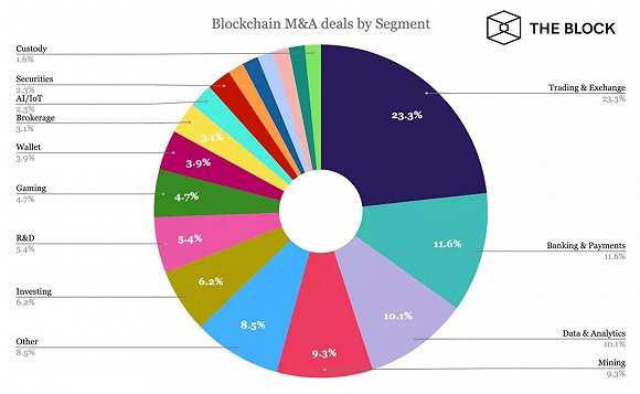 2、加密交易类产品和加密交易所的交易规模占到总兼并收购报告交易价值的48%,交易量约占总兼并收购交易量的23%;